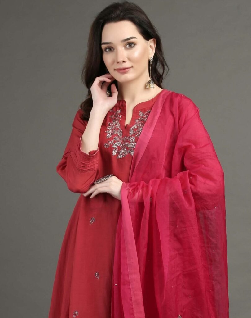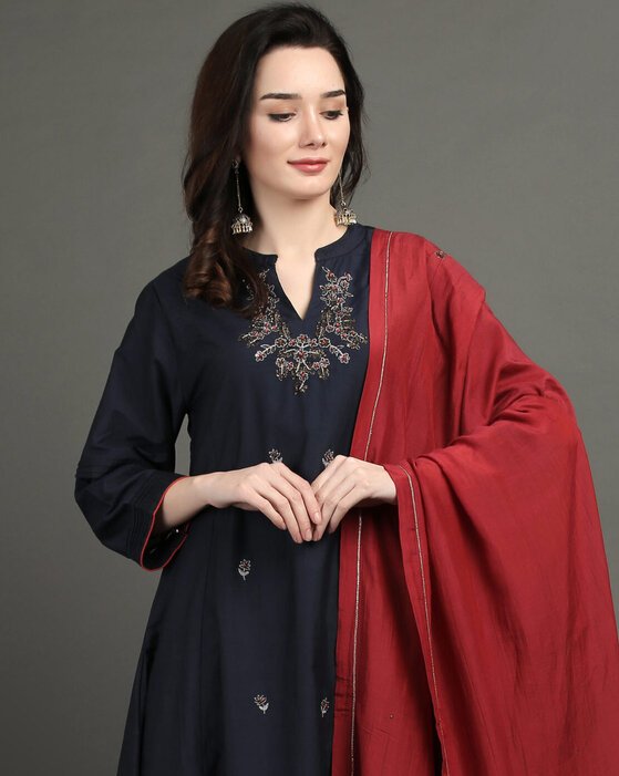 JACQUARD HAND EMBROIDERED A LINE KURTA, PANT & DUPATTA(Set of 3)
